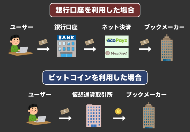 ビットコインは、銀行口座を介さずオンライン上だけでやりとりできるためブックメーカーなどのオンラインサービスとかなり相性がいいです。