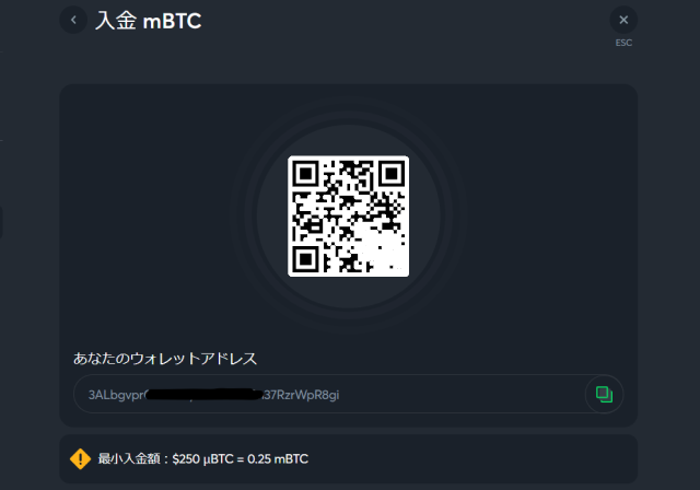そして下記は2回目にビットコインの入金を行おうとした際のウォレットアドレスです。