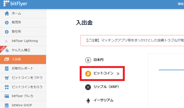例えばbitFlyerの場合、メニューの『入出金』から『ビットコイン』を選択し、そのまま画面の案内に従って入金をします。