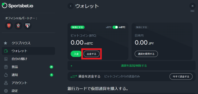 次に、ブックメーカーからビットコインを出金する方法を解説していきます。入金手続きと同じく、Sportsbet.ioを例にしています。