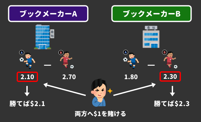 ブックメーカーにおけるアービトラージは、複数のブックメーカーを利用して勝敗ベットの勝ちと負けのどちらにも賭ける方法です。