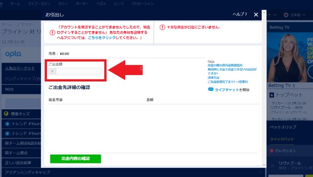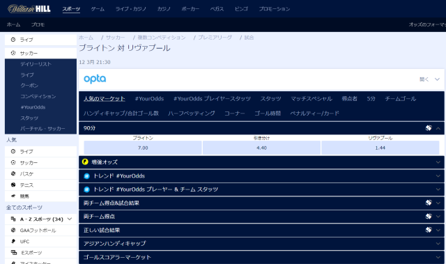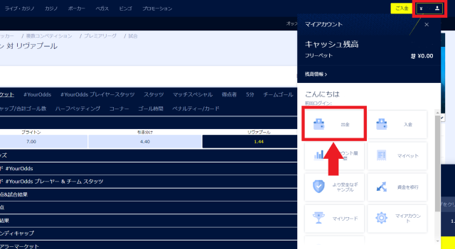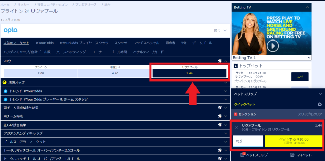 では、いよいよ実際にベッティングします。今回は、サッカーの試合の『ブライトン対リヴァプール』の勝敗ベットでリヴァプールの勝利にベットします。