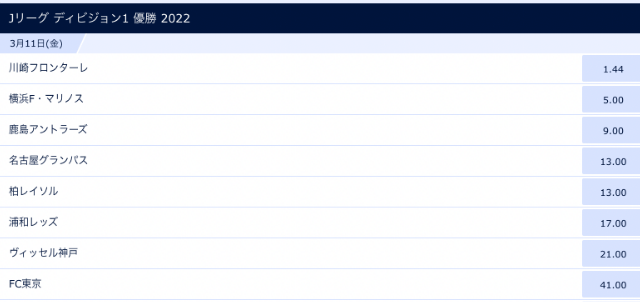 下記はウィリアムヒルカジノのJリーグ優勝予想ですが、開幕の2月19日から、3月11日までにベット可能なオッズです。