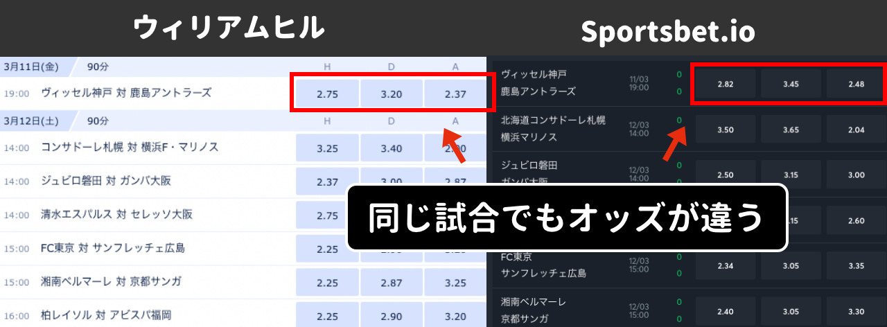 Jリーグは様々なブックメーカーで取り扱いがありますが、サイトによってオッズが少し異なります。