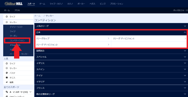 サイトのメニューからサッカーを選び、その中から『コンペティション』をクリックしてください。すると各国のリーグが表示されます。