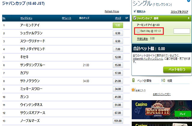 気をつけたいのはこの「Each Way」を選択すると、賭け金の入力欄に打ち込んだ数字の2倍の額、例えば100ドルと打ち込めば実質200ドル賭けることになるということです。