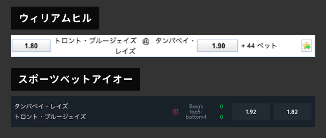 ウィリアムヒルカジノとSportsbet.ioでMLBの同じ試合を比較してみましょう。