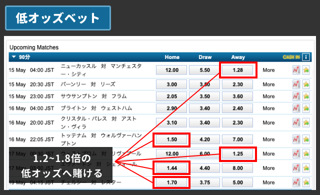 まず紹介するのはブックメーカーでもオーソドックスな低オッズ(評価の高い)チームへのベッティングです。