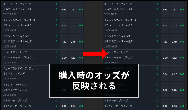 ブックメーカーでは、原則として購入時点でのオッズが適用されます。試合後にオッズが大きく変動したとしても、購入時のオッズに基づいて払い戻しが行われます。