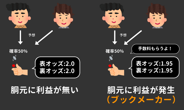 ギャンブルを仕切る胴元と実際に賭けをする2人以上のプレイヤーがいる場合、コインの裏と表それぞれの配当を2倍にしてしまうとギャンブルを仕切る人には利益が発生しません。