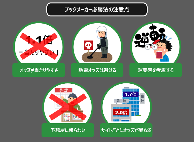 今回紹介したブックメーカー必勝法は、そのまま実行すれば必ず勝てるようになるというものではありません。勝てる可能性を少しでも上げるためにも、以下5点に注意してください。