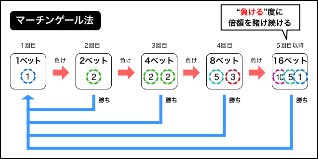「マーチンゲール法」とはギャンブルをしたことがある人なら一度は考えたことのある手法ではないでしょうか。簡単に言うと、勝負に負けたら、次の賭け金を前回の倍にする方法です。