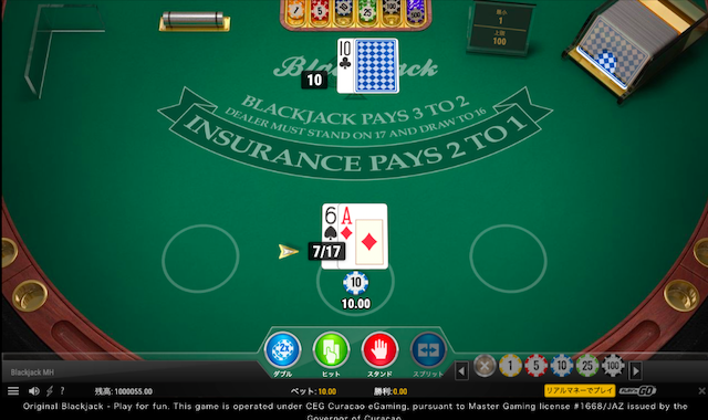プレイヤーのカード合計が「7/17」、ディーラーのアップカードが「10」です。