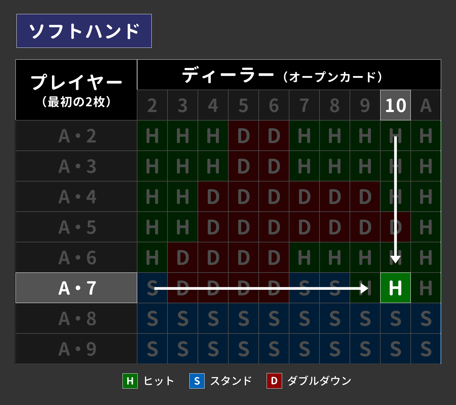 プレイヤーのカードが「A・7」なので、最善のアクションは「H:ヒット」です。「A」は「1」もしくは「11」と数えられるため、ソフトハンド表ではヒットと示されるケースが多くなります。