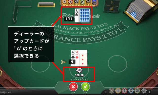 ブラックジャックにはインシュランスという賭け方があり、ディーラーのアップカードが「A」でブラックジャックになった場合に、プレイヤーの収支を±0にすることができます。