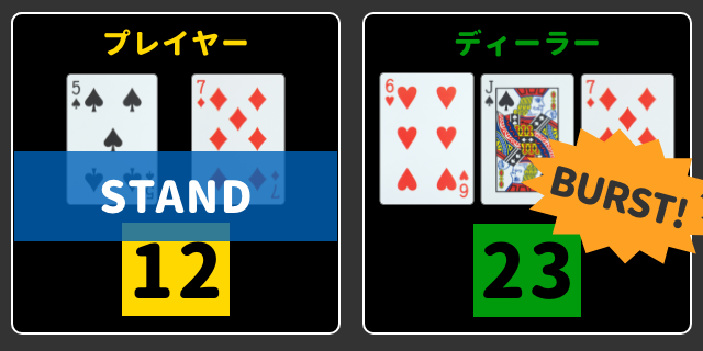 この場合、プレイヤーがヒットするよりも、ディーラーのバーストを待つ方が勝つ確率が状況であると言えます。