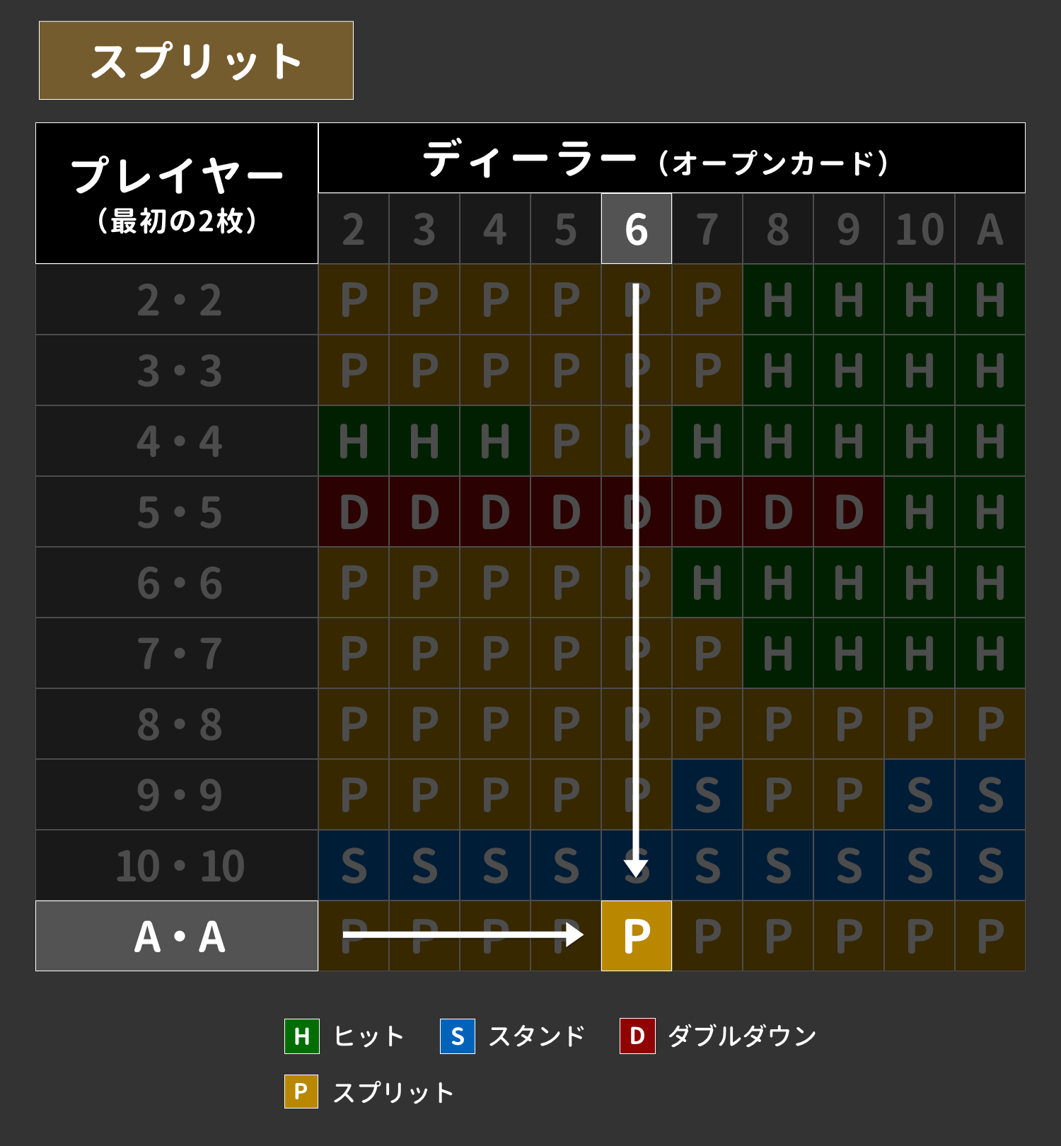 上記の数字をスプリット表に照らし合わせると、次のアクションが「P:スプリット」と示されていました。
