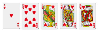 ![]() | 【ロイヤルストレートフラッシュ】 ポーカーで一番強い役。 「10,J,Q,K,A」の数字と同じスーツ(マーク)で完成する。 | 0.00015% |