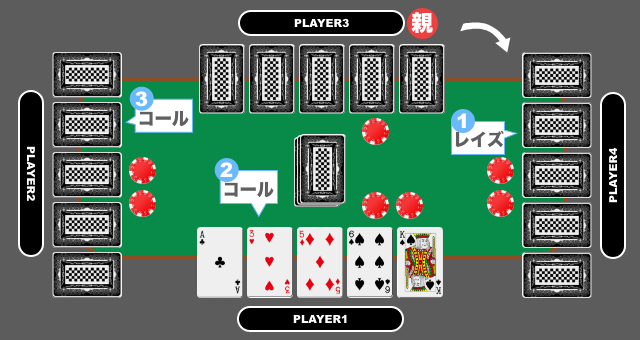 | レイズ(raise) | 先にベットしたプレイヤーよりも多い額のチップを出す。 べと額を吊り上げながら、ゲームに参加し続ける意思表示になります。 |