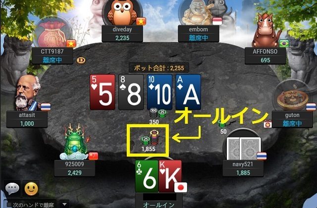 そこでプレイヤーは手持ち資金全額$1,855を賭けました(オールイン)。