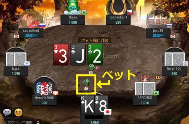 フラッシュが完成した時の勝てる可能性をより高めるため、3人の対戦相手のうち1人でもフォールドさせようと思い、プレイヤーは$80をベットします。