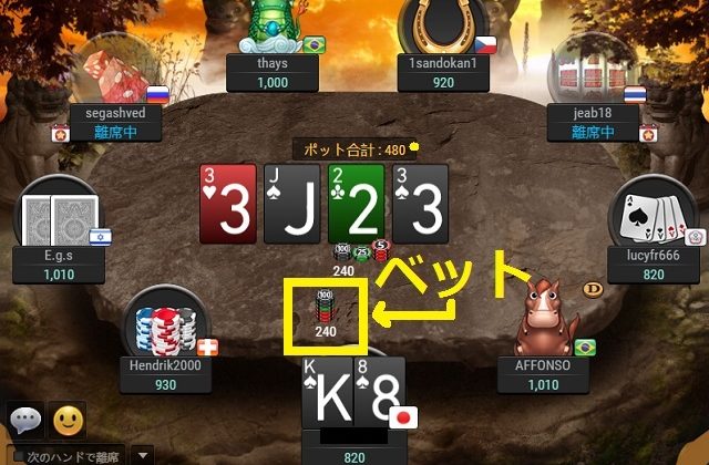 そこでプレイヤーは$240をベットします。万が一、④にコールされても最後にスペード♠が落ちて勝利することに期待できます。