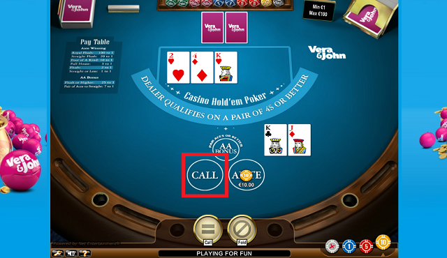 この章ではカジノホールデムの具体的な遊び方について、ベラジョンカジノで遊べる「Casino Hold’em」の画像を引用しながら詳しく解説していきます。 ここでルールや流れを詳しく知れるので、初心者の人は何度も読み込んで、実際にプレイしてみましょう。