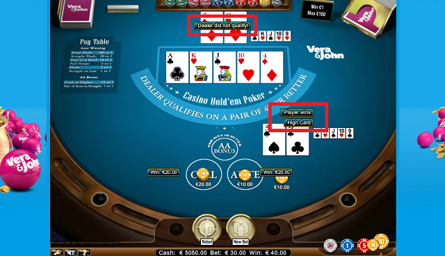 仮に自分の役が「ロイヤルフラッシュ(配当100倍)」だったとしても、ディーラーがゲームを降りていますので、アンティに賭けた金額と同額の配当しか獲得できません。