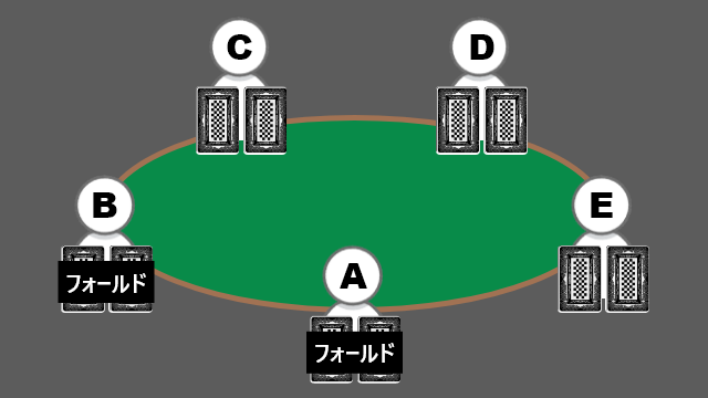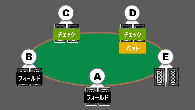 Cはゲームに参加し続け、DとEのアクションを待ちます。Cの次のDは、チェックまたはベットを選択可能です。
