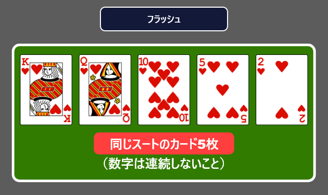 フラッシュとは「同じスート(マーク)のカード5枚で構成される役」です。