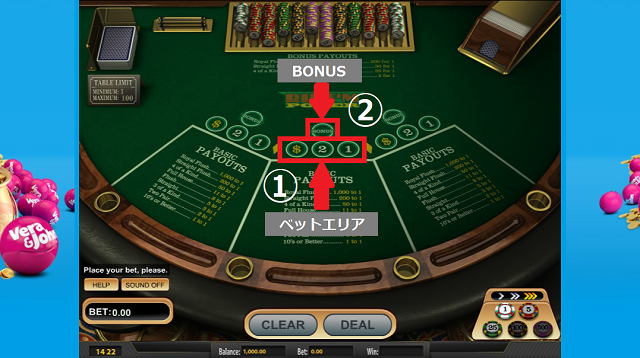 下の画像はベラジョンカジノの「Ridem Poker」で、最高ベット金額は$100です。このゲームは1人プレイ用ですので1人分のベットエリアしかありませんが、本場カジノのテーブルとの違いはありません。