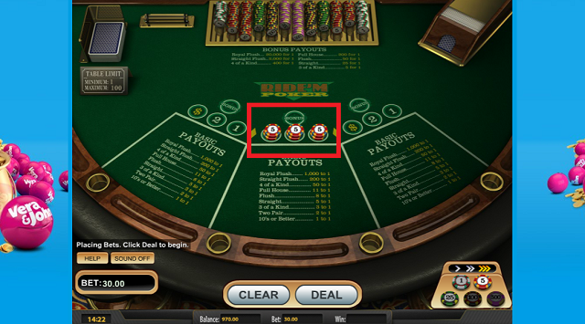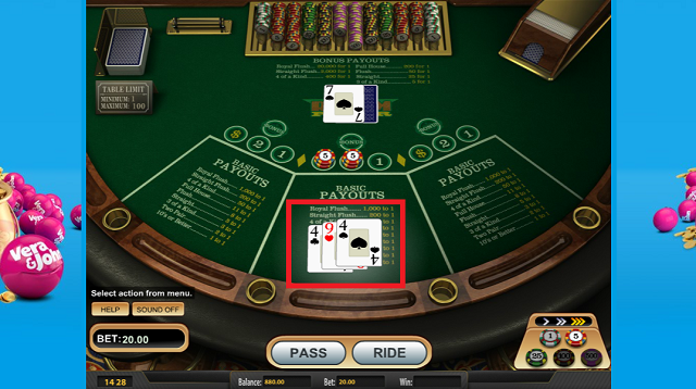 次にレットイットライドポーカーの具体的な遊び方について、ベラジョンカジノで遊べる「Ridem Poker」の画像を引用しながら詳しく解説していきます。