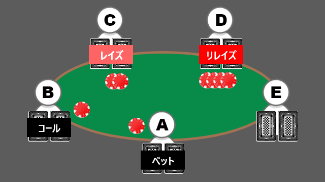 - ラウンドで2回目のレイズはリレイズ、3回目のレイズはリリレイズと呼ぶ。