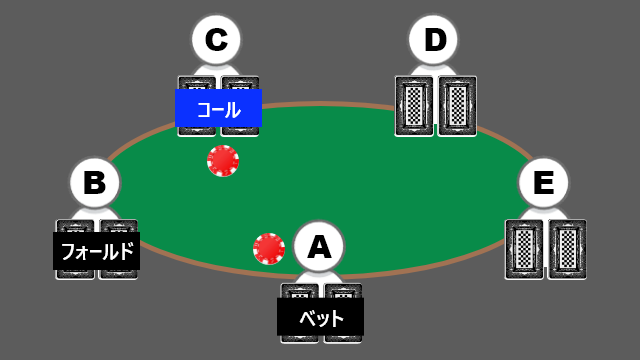 | コール | 一番多く賭けたプレイヤーと同額のチップを賭けること。弱気なアクションとされています。 |