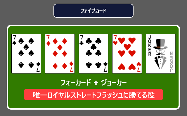 ジョーカーありのポーカーの場合、ジョーカーと同じ数字のカード4枚で構成されるファイブカードという役があります。