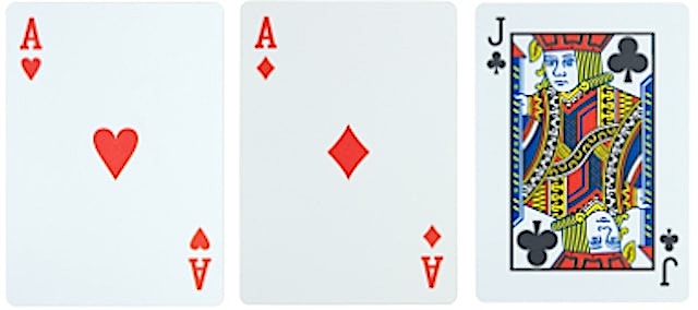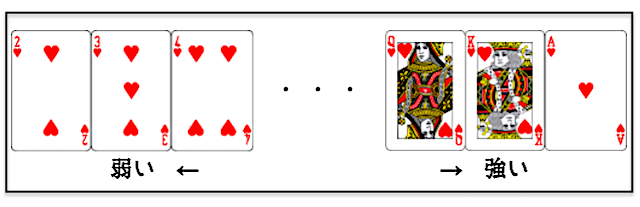 スリーカードポーカーにおけるカードの強弱は、他のポーカーと同じように「A」が最も強く、「2」がもっとも弱いカードとなります。