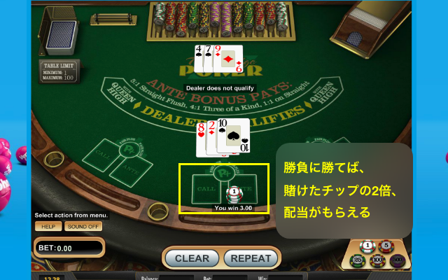 ディーラーが勝負から降りた場合の配当は、アンティに対する配当のみで、コールに賭けた分の配当はプレイヤーに戻ってきます。