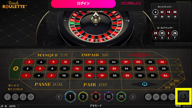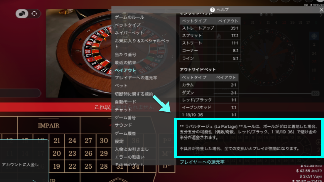 なお、「アンプリゾン」「ラパルタージュ」ともに、賭け金が返金されるのは、配当2倍(赤黒、偶数奇数、ローハイベット)の時のみです。