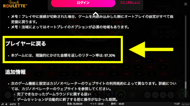 フレンチルーレットの還元率も、配当と同じようにゲーム画面のヘルプからチェックできます。