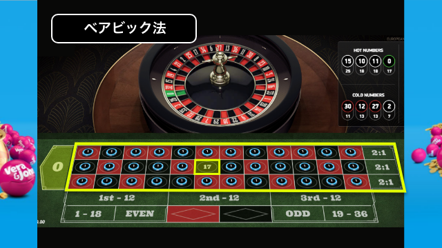 ベアビック法は、ダズンベットの横3列の中から2列に賭ける、もしくはコラムベットの縦3列の中から2列に賭けた後、「0」を含めた13個の数字の中から11個ストレートベットする方法です。