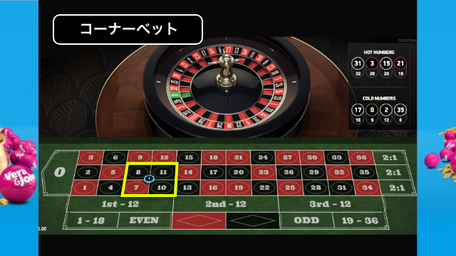 コーナーベットの確率をルーレット別に計算すると、アメリカンルーレットが約5.2%、ヨーロピアンルーレットが約5.4%になります。もらえる配当は17倍です。