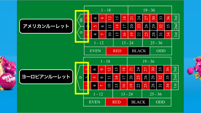 2つのルーレットの違いは「0」と「00」の数字です。「0」「00」がある方はアメリカンルーレット、「0」がある方がヨーロピアンルーレットになります。