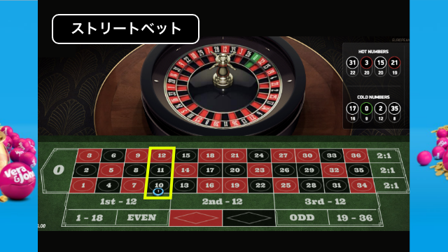 もらえる配当は11倍です。この賭け方は最大で12箇所中11箇所まで賭けることができます!当たれば収支はプラスです。