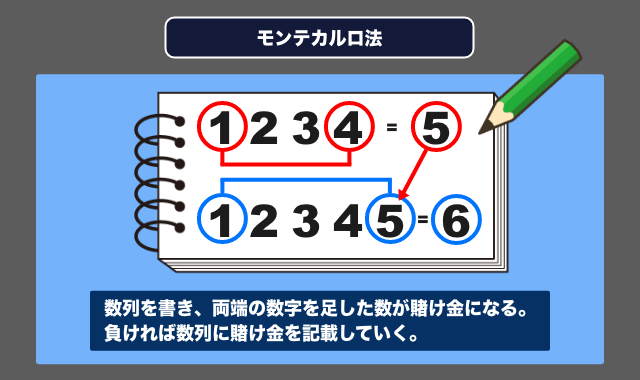 上記画像のように「1,2,3,4」と数字を並べて、両端の数字の合計を賭け額(1+4=5)とします。負けたらその賭け額を右端に追加し、勝ったら両端の数字を消してください。足し合わせる数字がなくなったら利益が出ます。