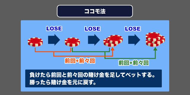 ココモ法を使用するのは2連敗後からで、3ゲーム目から「前々回の賭け金+前回の賭け金」を勝つまで続けます。1勝でもできたら成功です。