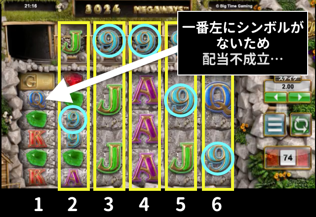 例えば以下の例ですと、2〜6列まで順番に『9』のシンボルが出現していますが、一番左の1列目にシンボルがないため配当は不成立です。