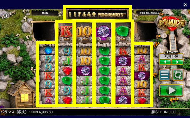 ボナンザは、リールの中のシンボル数がスピンごとに変動し、ペイラインも最大117.649通りで当たりやすいのが魅力です。