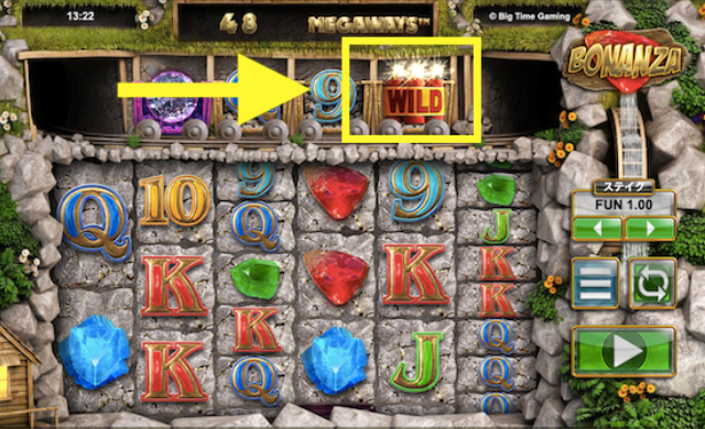 ボナンザのワイルドシンボルは3つの赤い爆弾に『WILD』と書かれていて、スロット最上部にあるカートで運ばれてきます。