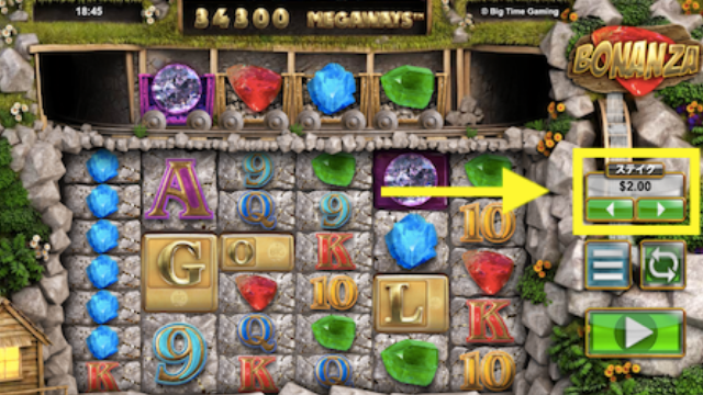 まず、ボナンザを起動したら好みのベット額を設定します。ベット額は、プレイ画面右端にある『ステイク』から設定可能です
