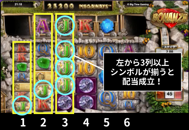 ボナンザはリールが全部で6列あり、左からシンボルが3列以上出現すると配当成立となります。